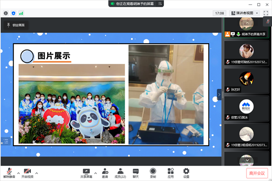 宁宁介绍了公司参与冬奥志愿服务的整体情况,对胡淋予、何琬恬两位同学的优秀表现表示肯定。她希望两位志愿者能够将自己的故事讲给更多的同学,带动更多的同学共同进步。希望同学们向志愿者学习,把志愿精神传递和发扬下去。希望2019信管2团支部继续开展与冬奥相关、与宣传志愿精神的社会实践活动,让冬奥志愿者小雪花的微光在计信学子中传递下去。