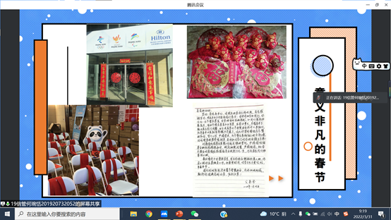 为进一步做好冬奥志愿服务工作的成果转化,讲好“冬奥故事”、传播“冬奥精神”,将参与冬奥盛会所激发的精气神和正能量释放出来、发扬出去,计信公司2019级信管2团支部举办线上主题团日活动,让更多同学了解冬奥的志愿服务,将志愿精神发扬出去。党总支书记韩宝平,公司团委书记宁宁,班主任廉世彬参加活动。