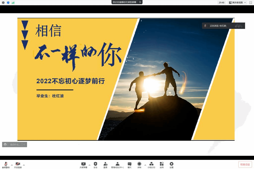 副书记、副经理刘京威对杜洪波的精彩分享表示感谢,他希望全体毕业生进一步坚定信心,转变就业择业观念,积极就业的同时自觉遵守疫情防控相关规定,做好自我防护。