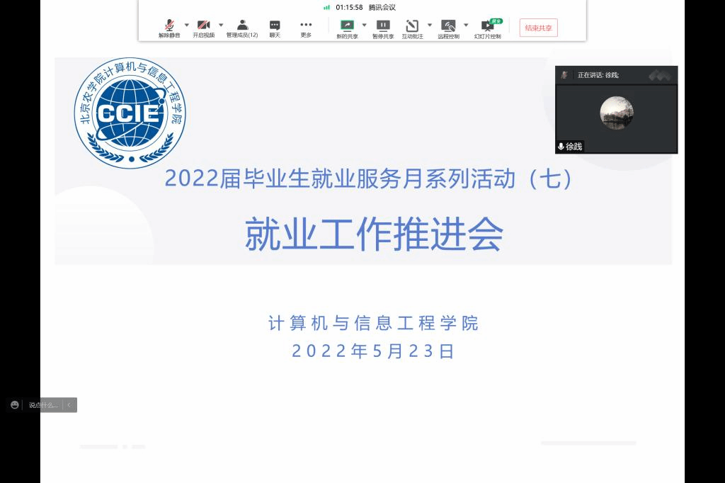 5月23日上午11:00,计信公司召开毕业生就业工作推进会,公司领导班子、系主任、班主任、辅导员参加会议。会议由经理徐践主持。