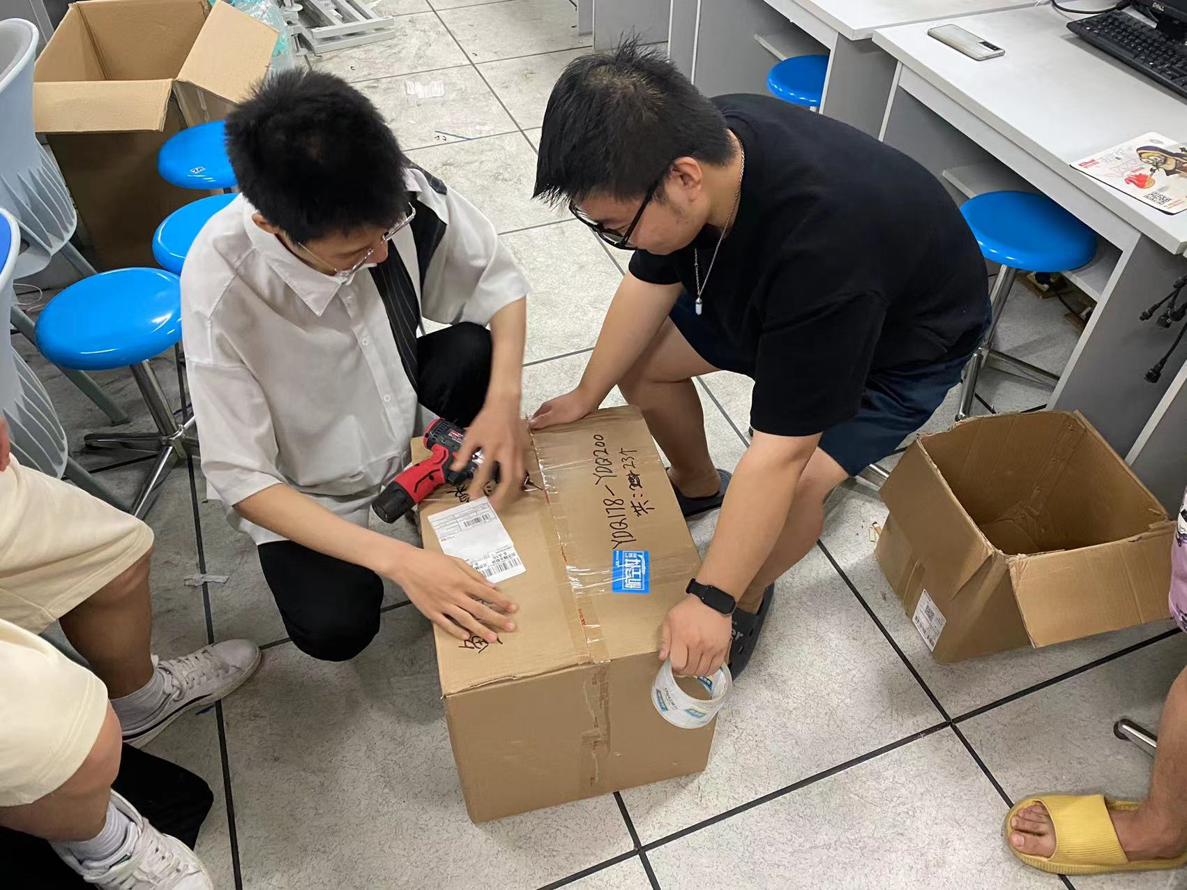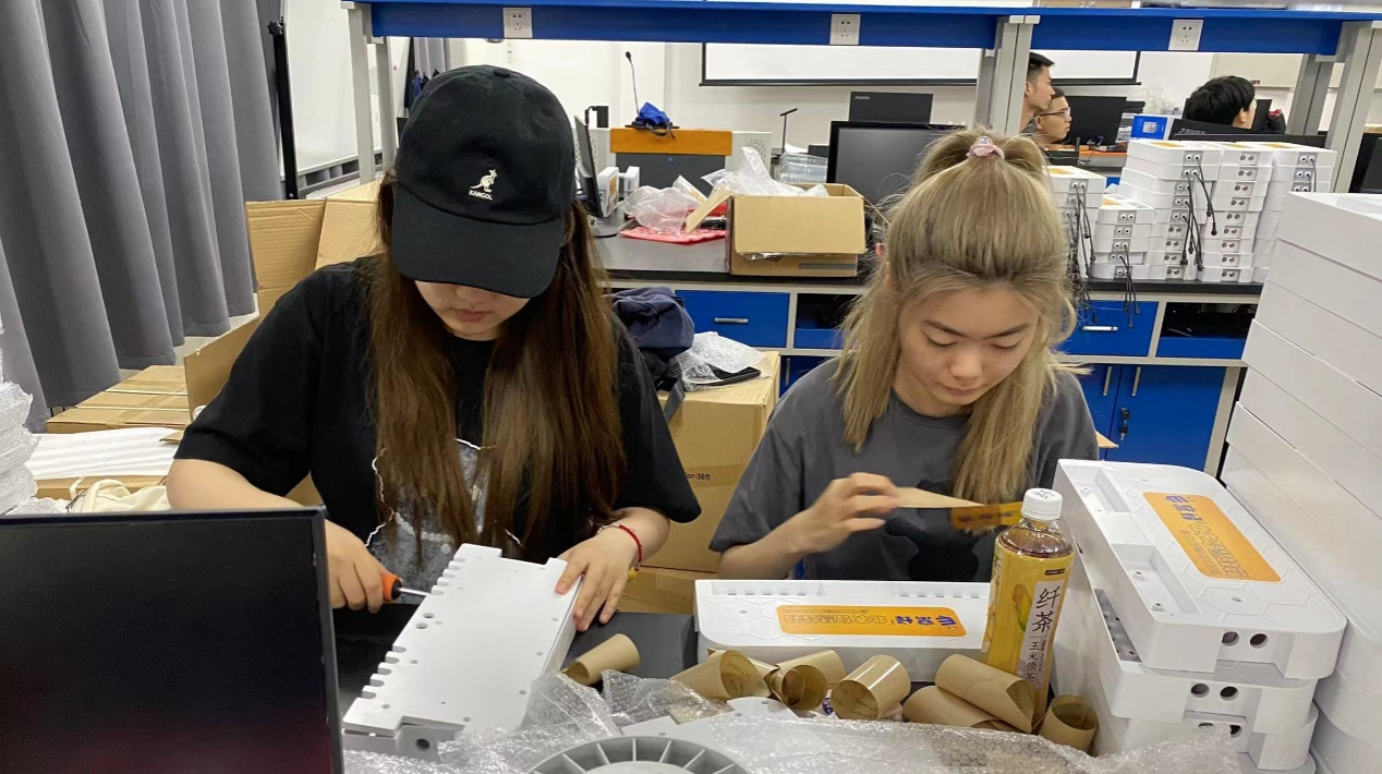 实践小组的同学们从蜂箱组装做起,焊接、拼装、连线、测试,一个小小的蜂箱需要繁琐的很多步骤,每一小部都不能出错,同学们每天高标准、严要求,以保证每一个蜂箱组装的精准度。
