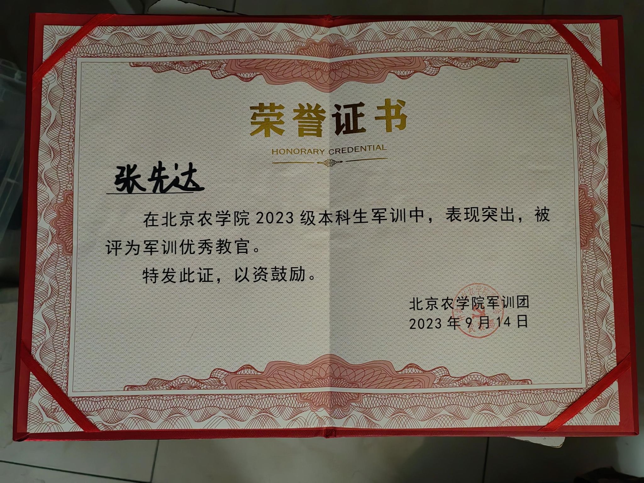 在为期三周的军训过程中,始终坚持高标准,落实会讲、会做、会教、会做思想工作的“四会”教学法和“见第一就争,见红旗就扛”奋斗的目标,虚心向别人请教,耐心和同学们商量,共同想办法,共同解决问题,相互学习,一起进步。所带六连在军训中歌咏比赛、队列会操、定向越野中均取得了第一名的优异成绩。本人被评为优秀教官。