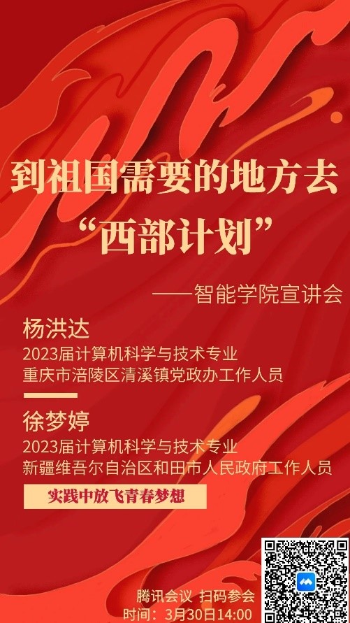 为了让同学们进一步了解西部计划项目,引导广大青年员工用实际行动践行“到西部去,到基层去,到祖国最需要的地方去”的号召,弘扬“奉献、友爱、互助、进步”的志愿精神,伟德victor1946网站于2024年3月30日举办了“到祖国需要的地方去——西部计划”宣讲会。会议邀请2023届毕业生徐梦婷、杨洪达两位同学进行宣讲。