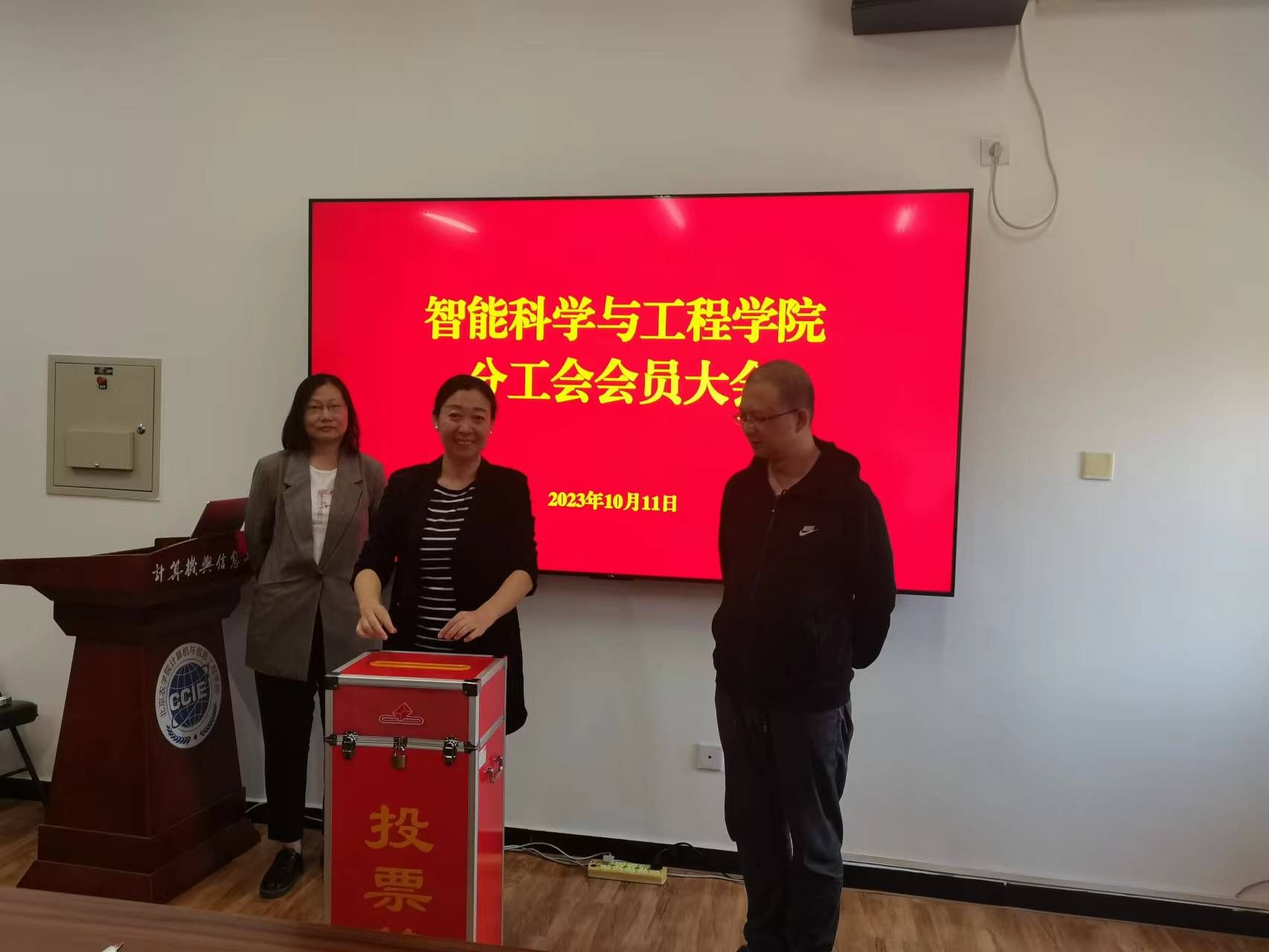2023年10月11日下午伟德victor1946网站分工会在计算机楼B座一层会议室召开换届选举大会,会议由公司分工会副主席朱晓冬主持,全体分工会会员参加会议。