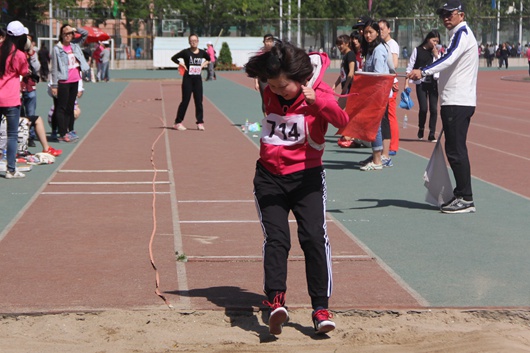 运动健儿们成绩的取得也离不开辛勤的后勤保障人员,早上不到八点,体育部的同学就布置好了服务台,为运动员和观赛同学准备良好的后勤服务保障。台上的观众们更是准备好了加油的道具,为运动员们加油呐喊。