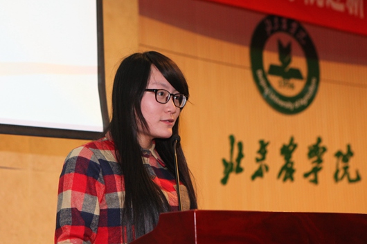 张博轩同学代表全体2014级员工发言,与大家分享了入学后的感悟。他说,三个月前带着对大学的憧憬来到农公司,领导老师的亲切关怀、学长学姐的热心帮助以及新同学的热情相待,让他在这个陌生的校园立刻感受到了温暖和家的感觉。他还说,虽然大学的学习和高中有所不同,但是相信2014级全体员工面对机遇和挑战,一定会迎难而上,在大学这片广阔的天空中收获自己的精彩。老生代表、国家奖学金获得者青晨同学与同学们分享了她的学习经验,她说,只要比别人认真一点,更加投入一点,就一定能收获的比别人更多。她还说,虽然大学是要培养大家自主学习、自我管理的能力,但在这背后有辛勤付出的老师,所以要时刻心怀感恩,要感谢任课老师的倾囊相授和时刻关注,要感谢宿舍同学同班同学的包容和理解,积极营造和谐友爱的氛围。