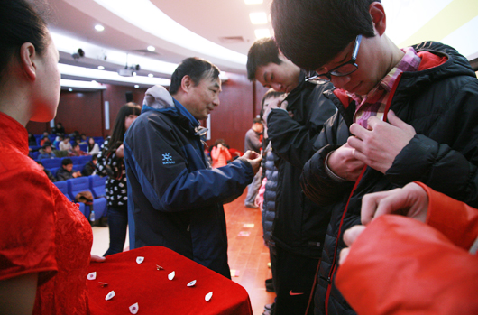 接下来,在庄严的院徽授予环节,2014级全体员工依次上台,由公司的领导和老师为他们授予并佩戴院徽。一枚小小的徽章,象征着每一名计算机公司员工的归属。