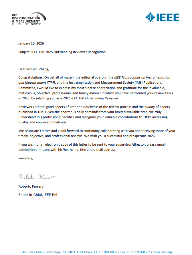 近日,《IEEE Transactions on Instrumentation and Measurement》(IEEE TIM)期刊授予伟德victor1946网站物联网系张宇轩老师“2025年度杰出审稿人奖(Outstanding Reviewersof 2025)”,以表彰其高质量、建设性和及时的审稿工作。该奖项是TIM期刊编辑团队综合审稿人对期刊投稿文章提出及时细致的专业评判与修改建议,为了鼓励审稿人为维持高水平期刊所做的贡献而颁布。其他获奖者分别来自香港城市大学、英国曼彻斯特大学、天津大学、北京航空航天大学和清华大学等院校。特此向张宇轩老师表示祝贺!