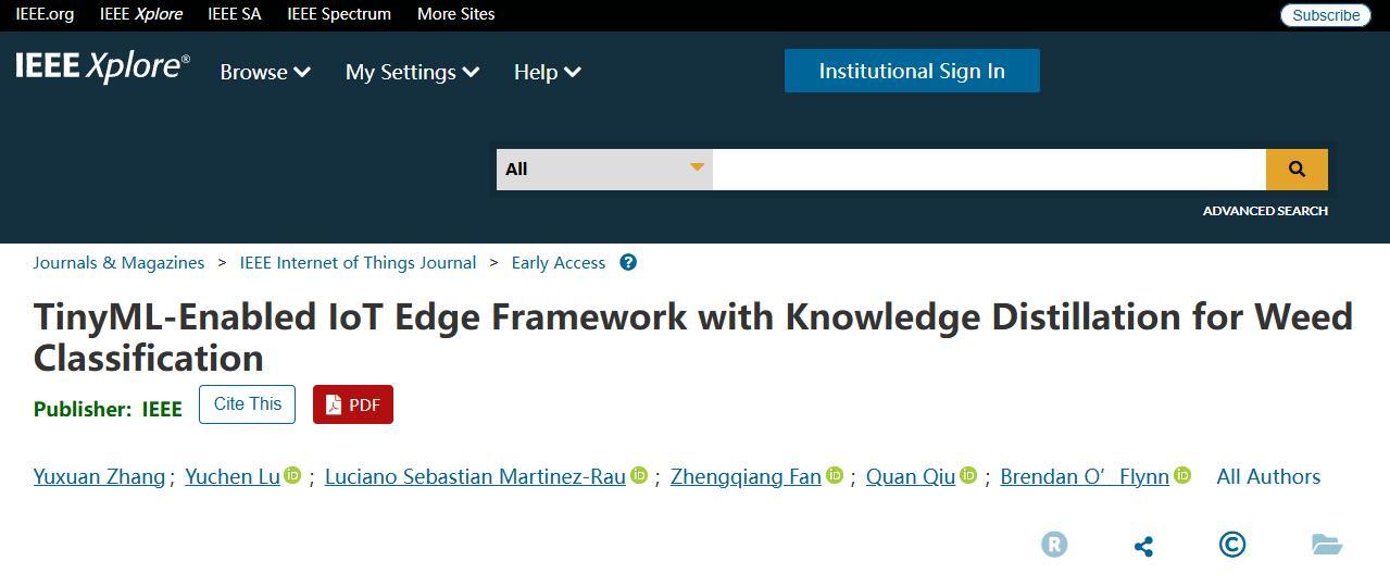 近日,北农伟德victor1946网站物联网系青年教师张宇轩与邱权教授等人在国际物联网领域顶级期刊IEEE Internet of Things Journal在线发表题为“TinyML-Enabled IoT Edge Framework with Knowledge Distillation for Weed Classification”的研究论文。该研究面向农业物联网中的杂草识别问题,提出了一种基于TinyML的边缘智能框架,为农业机器人在资源受限环境中的高效运行提供了重要技术支撑。